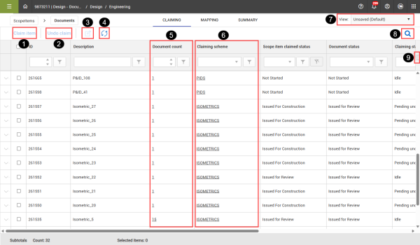You can manage document claiming in the Claiming tab of the Documents page. Claiming allows the scope managed in Design to earn automated claiming based on the associated document’s status from the document repository in InEight Document.