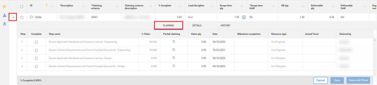 You can claim earned quantity against a scope item directly on the Scope items page. Claiming is done in the Claiming tab of a slide-out panel that can be expanded for each scope item in the grid.