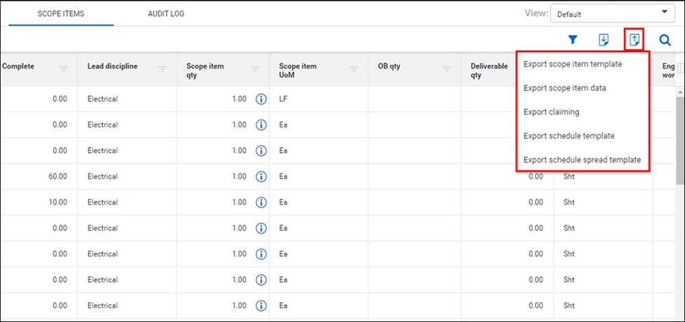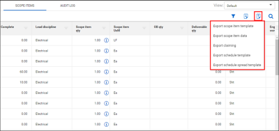 On the Scope items page, click the Export icon, and then select Export claiming. A Microsoft Excel spreadsheet is downloaded.