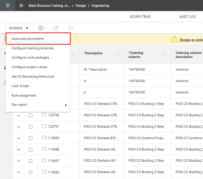 You can associate scope items and documents from InEight Document to support status and progress reporting on deliverables. Go to project > Engineering > Scope Items > Actions, and then click Associate documents to open the Associate documents page.