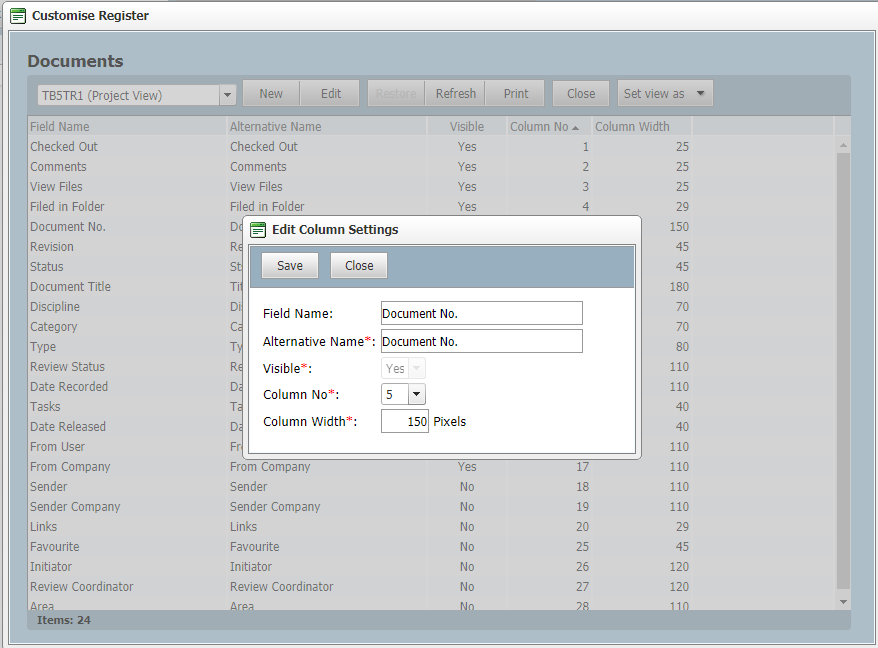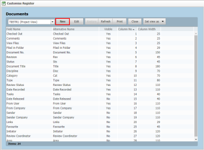 Users can customize the layout of columns in all registers. Each user can have up to three personal custom views of each register. These are in addition to views customized specifically for their Project and/or their Company. The instructions below are based on the Inbox mail register but apply equally to other registers.