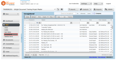 Generally Unregistered Mail is delivered back into InEight via a company or department Unregistered mailbox where it is accessed by an administrator for processing. However, if the Unregistered Mail is a response to InEight Mail it may return directly to the originator’s personal Unregistered Mailbox.