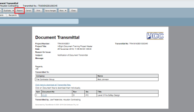 Transmittals can only be re-sent by the user who created them or other users within the same company/department based on access settings.