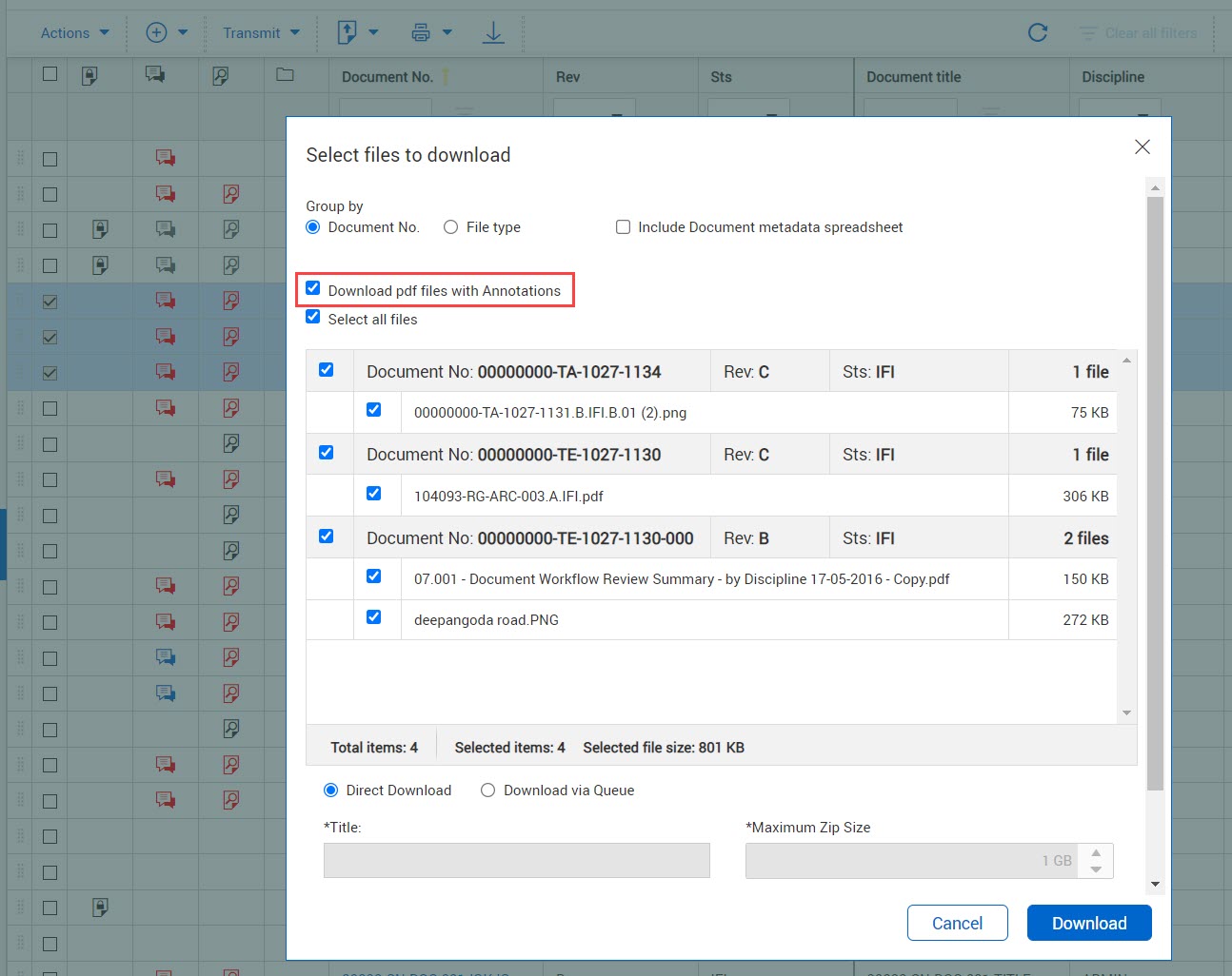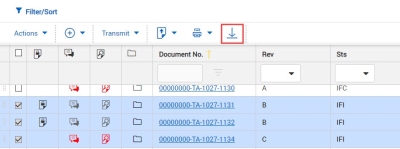 Download documents you have access to directly from the Register. The format columns indicate which formats the document is available in. An icon with a tick means you have access to the file and can download it. You can download the document with or without annotations (that is, markups).