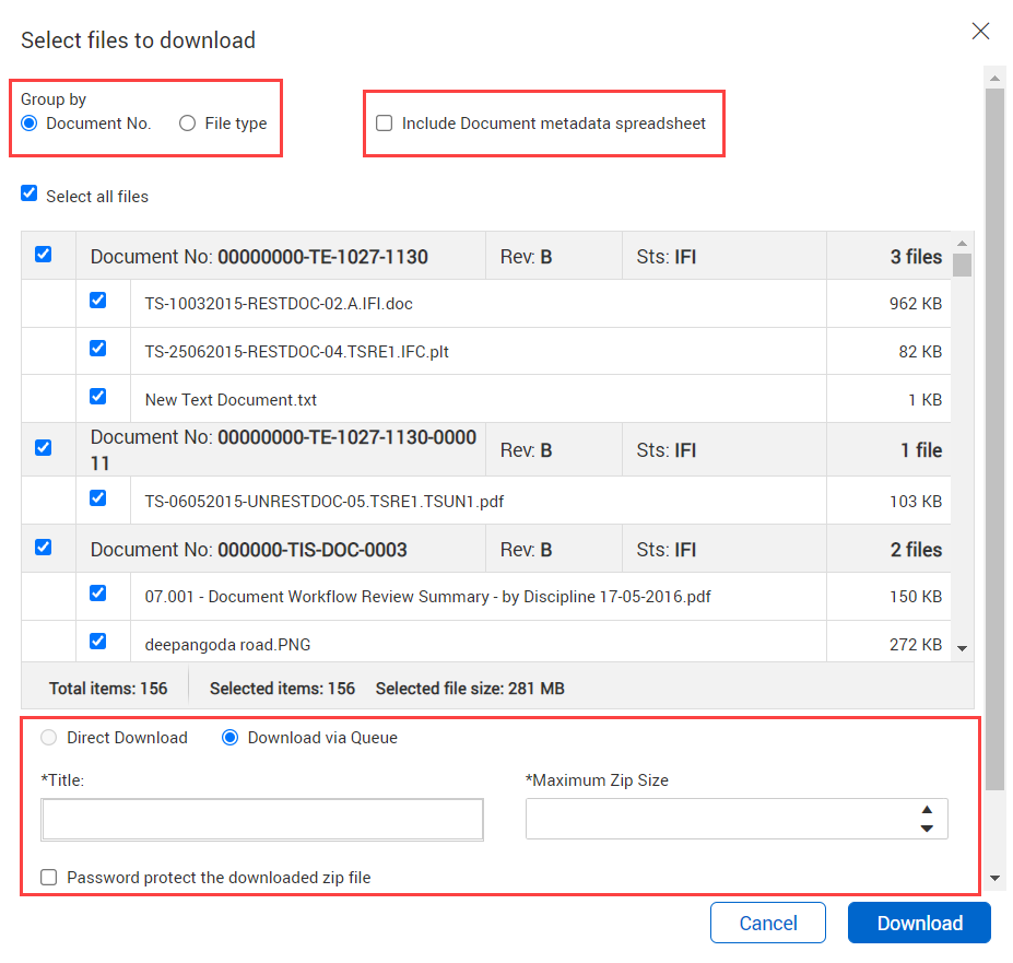 The option to download documents directly is available only when the number of documents is 100 or less. The documents are downloaded in a zip file. There is no password protection or control over the zip file size. If you want to protect the zip file with a password or control the file size, you can use the download from a queue method.