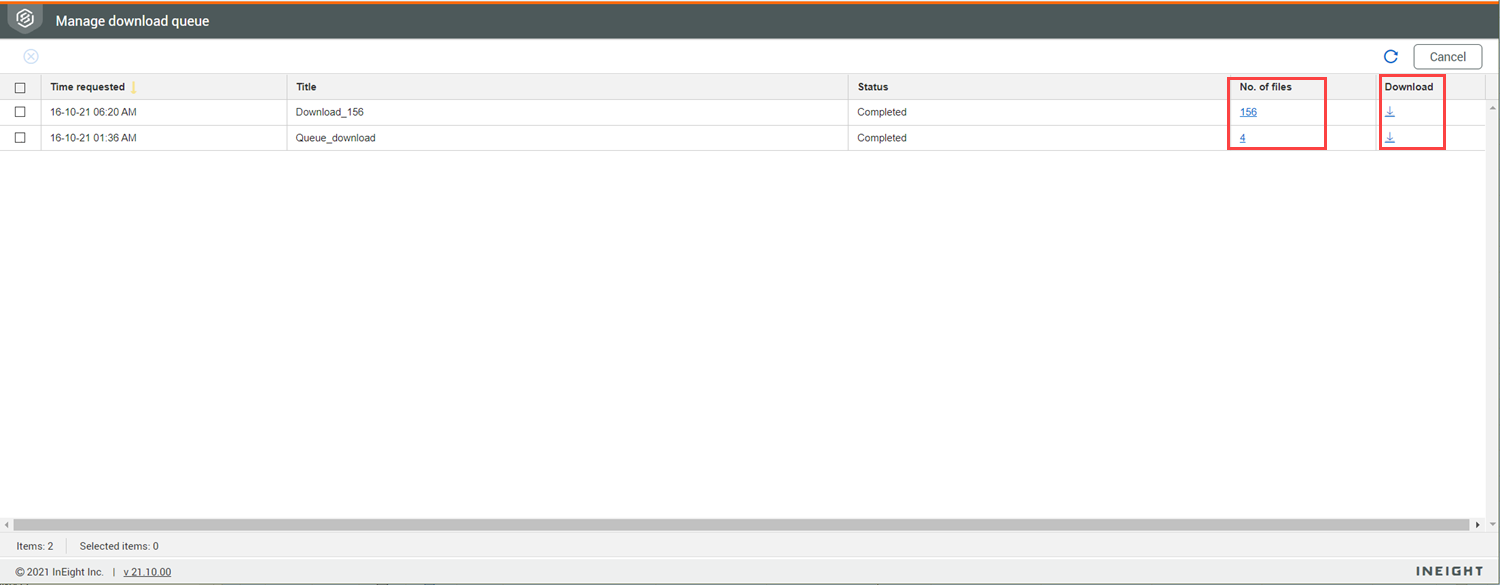 After you download files, you can go to the queue to manage the files. Expired downloads have a yellow exclamation point in the Download column of the Manage download queue. If a download has expired, you cannot download the documents to your workstation, and the documents must be downloaded to the queue again.
