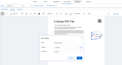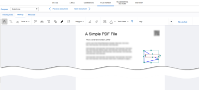 Tools on the Markup tab let you add text and other annotations to the PDF. When the Automatically save document markups setting (Settings > Project settings> Document > Comment) is enabled, your markups are saved automatically. If the setting is disabled, you must save any markups you make before closing the file. Save prompts are shown when windows, such as the Details page, are closed or when closing the viewer tab to ensure that you save all markups.