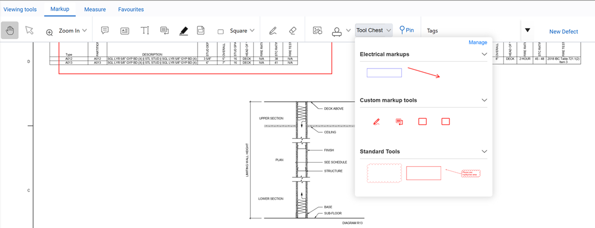 You can use the tool chest to create a library of custom stamps and annotations at the personal, company, or project level. You can group markups and properties to create custom annotations or import custom stamps.