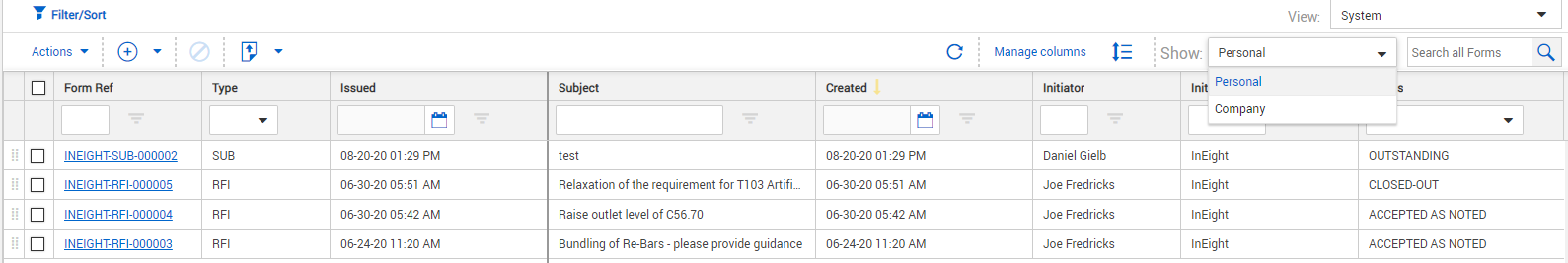 The default view will be for your Personal forms. If you have access to your Company forms you can toggle your Company view.