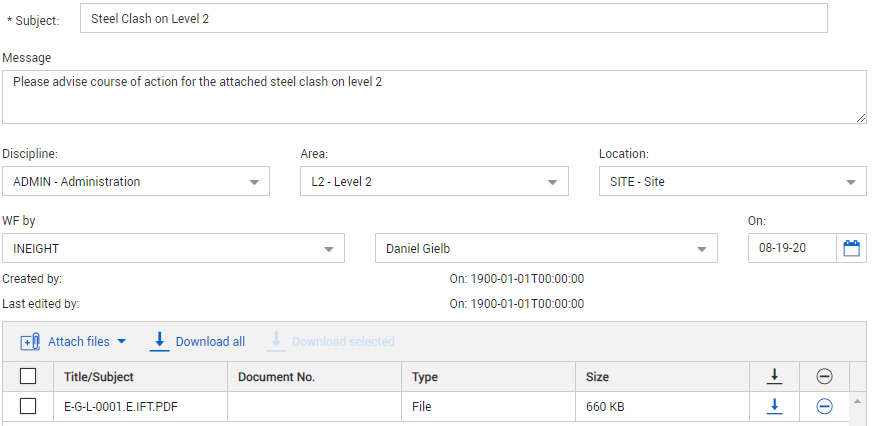 Initiator section: The initiator section of the form contains a distribution list, subject, message and standard fields (such as discipline, area and location). The recipient will also be able to see who created the form, who last edited it and the corresponding dates. Note: Only the Company administrator or the creator of the form can edit this section.
