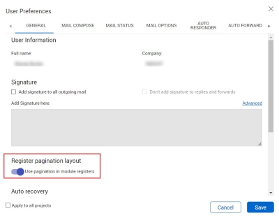 The paginated layout is configured for the project in the Miscellaneous tab of the project settings. When set to Yes, the Register pagination layout setting in your user preferences is enabled. If you want the option of switching from the detailed view to the paginated view, switch the toggle to Yes.