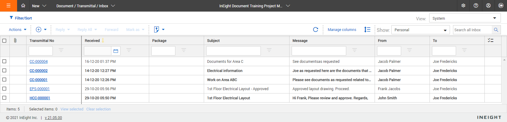 The transmittal module includes an Inbox, Drafts, Sent Items and Pending folders. If you have access, they can be found by selecting the transmittals module.