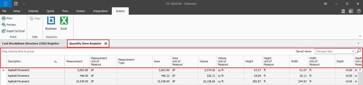 The Quantity Item Register columns provide quantity item details brought over from Bluebeam’s take-off data, including crucial information to assure that your estimate is accurate and up-to-date. Information brought over includes Page Label, Data Source, Reference Number, Quantity Item Author, Last Updated, Last Updated By. You can manage quantity items by filtering and grouping columns.