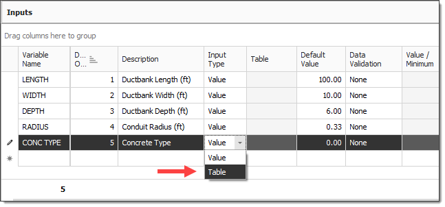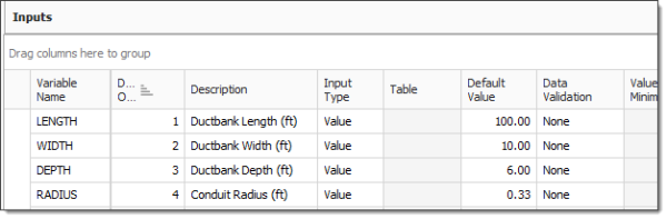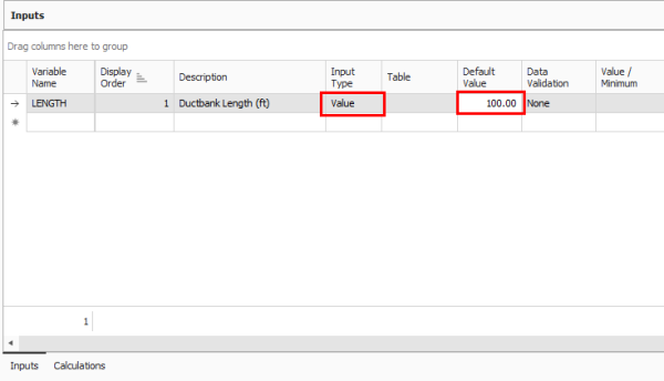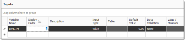 Navigate to the Inputs data block. In the first empty field under Variable Name, type in the name of a variable that will be referenced in the formula expressions, such asLength, then press Tab.