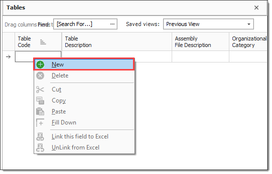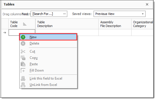 Right click in the Table Code field and select New.