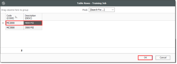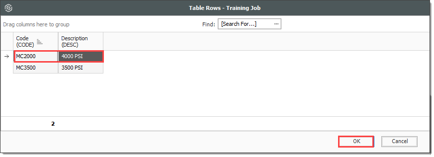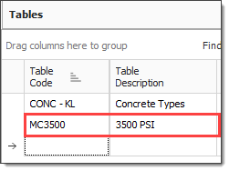 Within the Formula Editor, you can use tables to provide reference data for use in calculations. For example, the following illustration shows a table that stores values for various Concrete Strengths along with their associated resource code values.