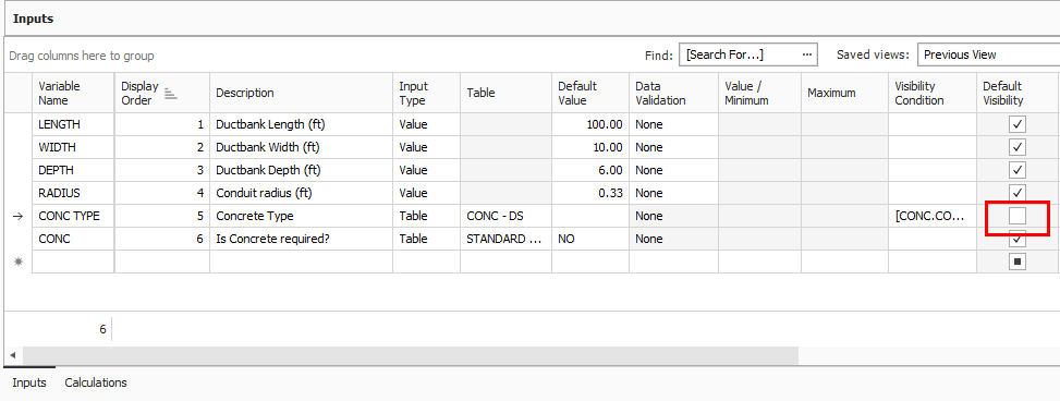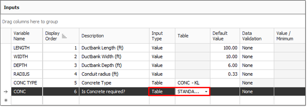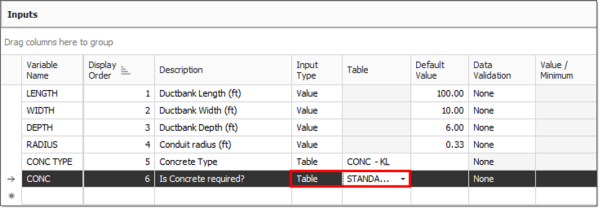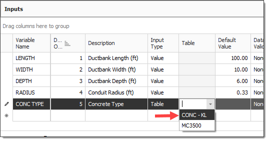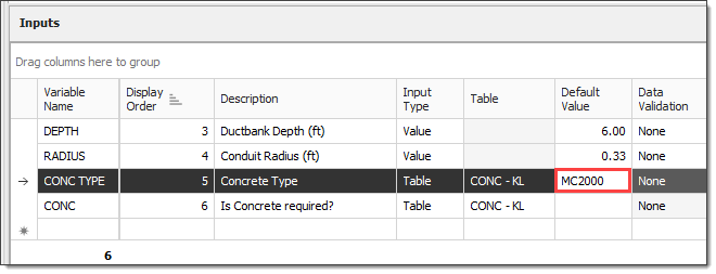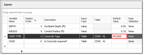 In the Inputs data block, select the Default Value field for the CONC TYPE input.