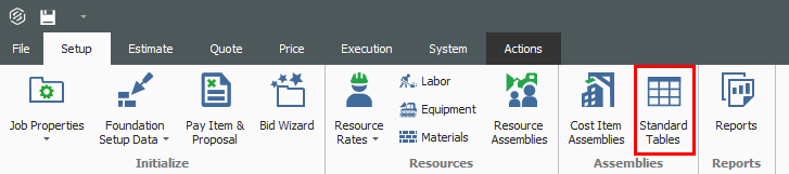 In the Setup tab, you can create standard tables for the project. These are created exactly like tables within the Cost Item Assembly Record. All users in the project have access to the standard tables. These tables can be copied and pasted into the Cost Item Assemblies’ tables. You can create, edit, or delete standard tables from the Standard Table Register. You can copy Standard tables from the library, to the library, and from another job.