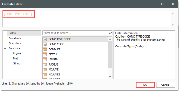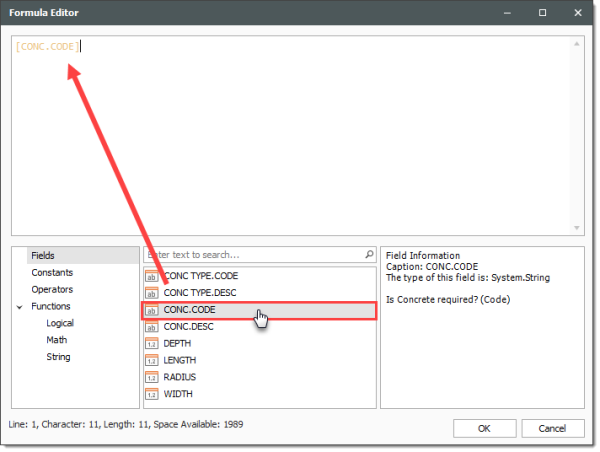 In the Formula Editor, and from the Fields section, double click [CONC.CODE].