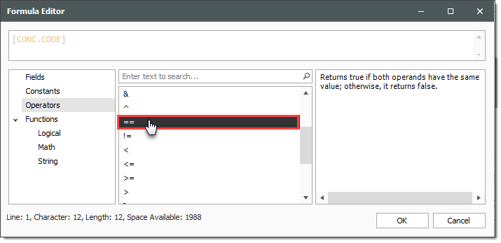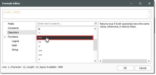 In the Operators field, double click on the ‘==’