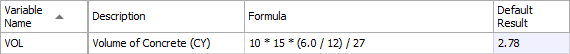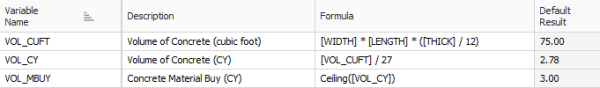 The [VOL_CUFT] calculation in the following example is the same as in the preceding example, but replaces the 10 foot, 15 foot, and 6 inch values with the variable names, which you would provide when the Cost Item Assembly is employed.