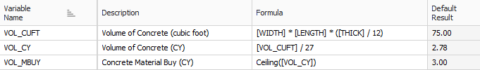 As an example, the Ceiling() function can be used to take the result of a calculation and round it up to the nearest whole number. In using the concrete slab example from above, the calculation [VOL_BUY] will take the result of the [VOL_CY] calculation and round it up from 2.78 CY to 3.00 CY using the syntax Ceiling([VOL_CY]), which represents the amount of concrete you would want to purchase for this work.