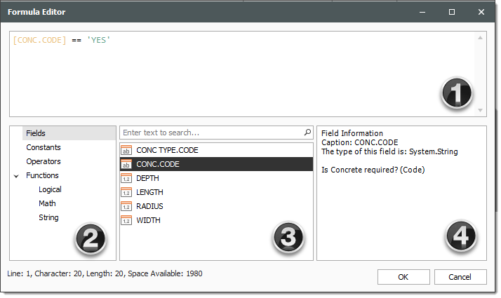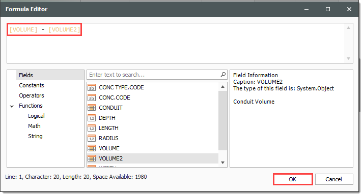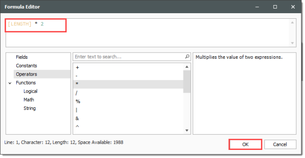 Enter the following formula, using the PI() function from the Functions > Math tab, the radius and length from the Fields tab, and the available Operators tab, then click OK.