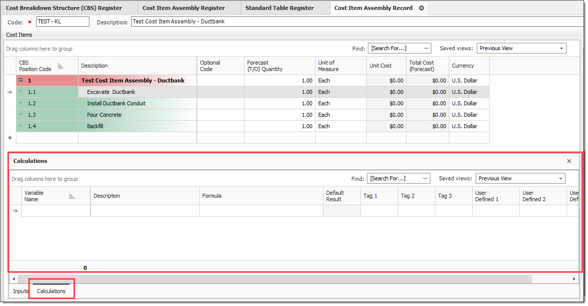More user tags and user defined fields are available on the Cost Item Assembly > Inputs data block related to a group of variables or with other similarities. A Standard View also exists, so you can define saved views to make use of the additional tags and fields.