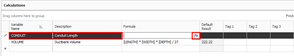 In the blank row under the Variable Name field, type Conduit and enter the Description Conduit Length, then click the fx button to open the formula editor.