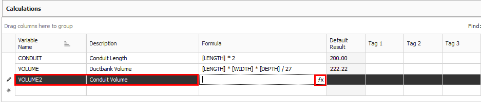 In the blank row under the Variable Name field, type Volume2 and enter the Description Conduit Volume, then click on the fx button to open the formula editor.
