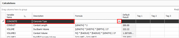 In the blank row under the Variable Name field, type Volume3 and enter the Description Backfill/Concrete volume, then click on the fx button to open the formula editor.