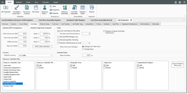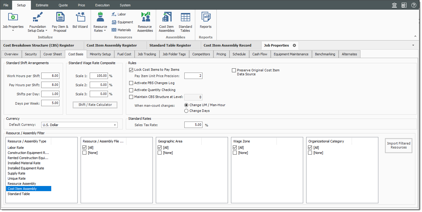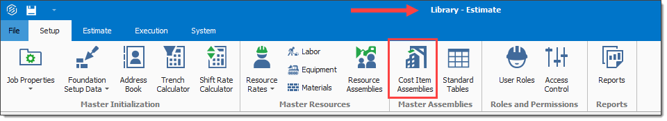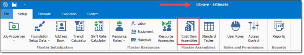 Cost Item Assemblies can effectively be used as a starting point for various components of an estimate. You can import job specific cost item assemblies by navigating to the Setup menu and selecting Setup > Job Properties > Cost Basis > Cost Item Assembly.