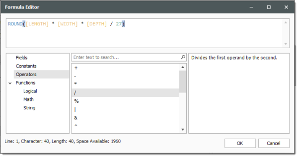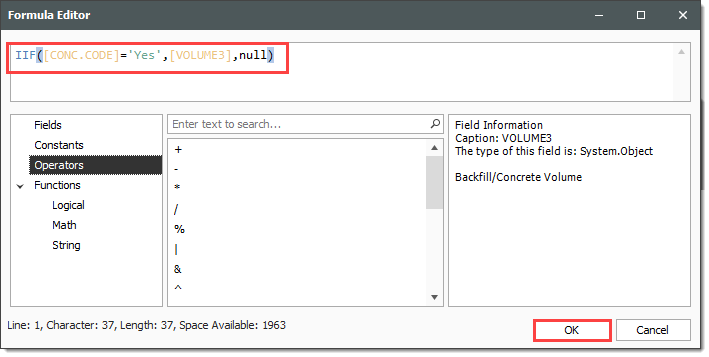 Using the Iif(, , ) function from the Functions tab, and the existing Volume3 calculations from the Fields tab, enter in the following formula, then click OK.