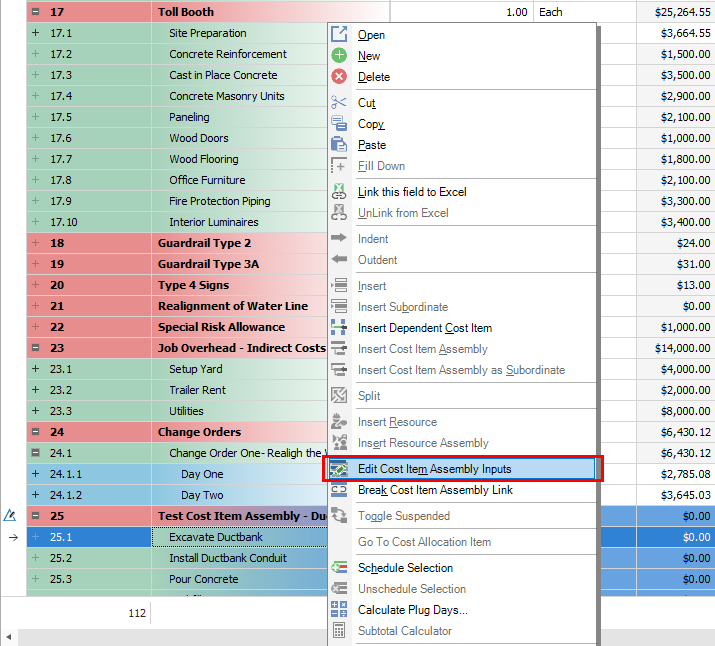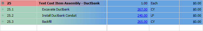 Employed Cost Item Assemblies are read-only cost items in the CBS register, but the inputs that were provided by the user to create the cost items can be modified to update the resulting cost items. If you change one variable in the cost item assembly, it will automatically update all associated cost items.
