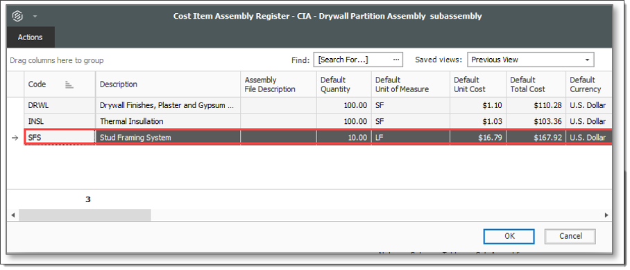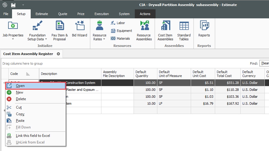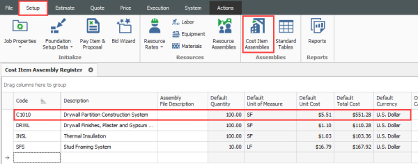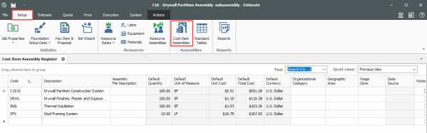 To access a cost item assembly record, select Setup > Cost Item Assemblies. The Cost Assembly register will open.