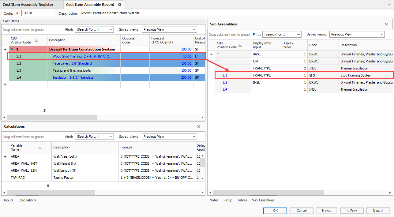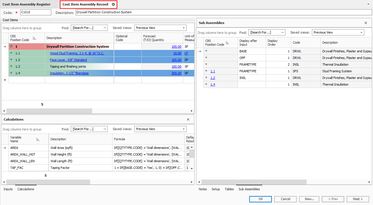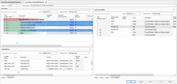 With the Sub-Assemblies in the Cost Item Assemblies form, you can easily create and maintain cost item assemblies that model construction systems and contain multiple complex calculations. Sub-assemblies enable the Cost Item Assemblies feature to be more modular, allowing you to maintain smaller, simpler versions of cost item assemblies and reuse them in multiple places.