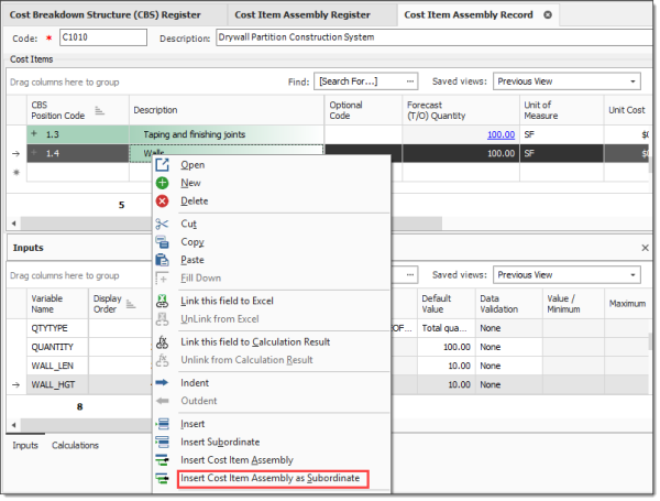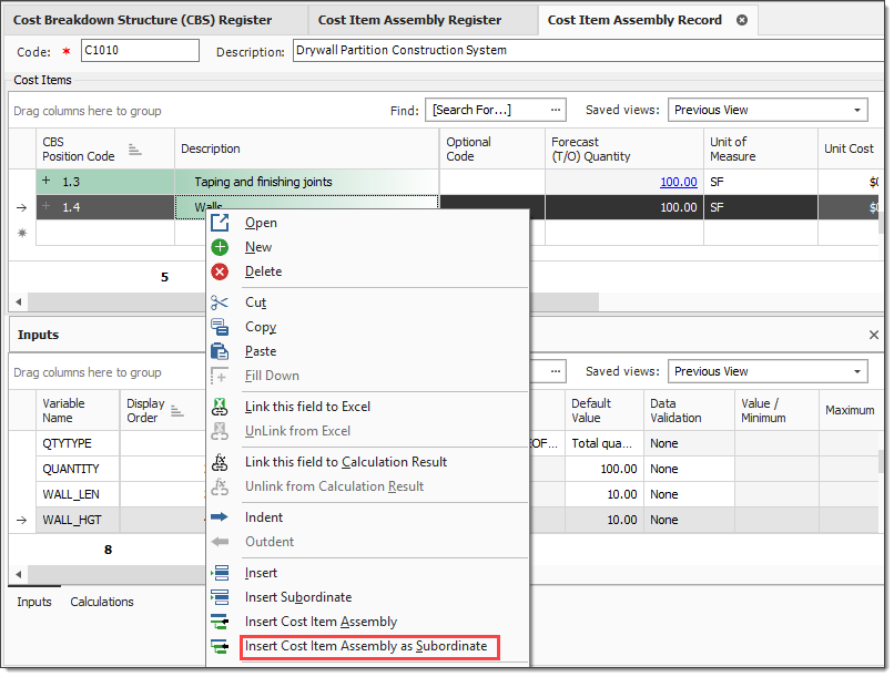 A sub-assembly can be created within a cost item assembly by simply inserting it as a subordinate cost item.