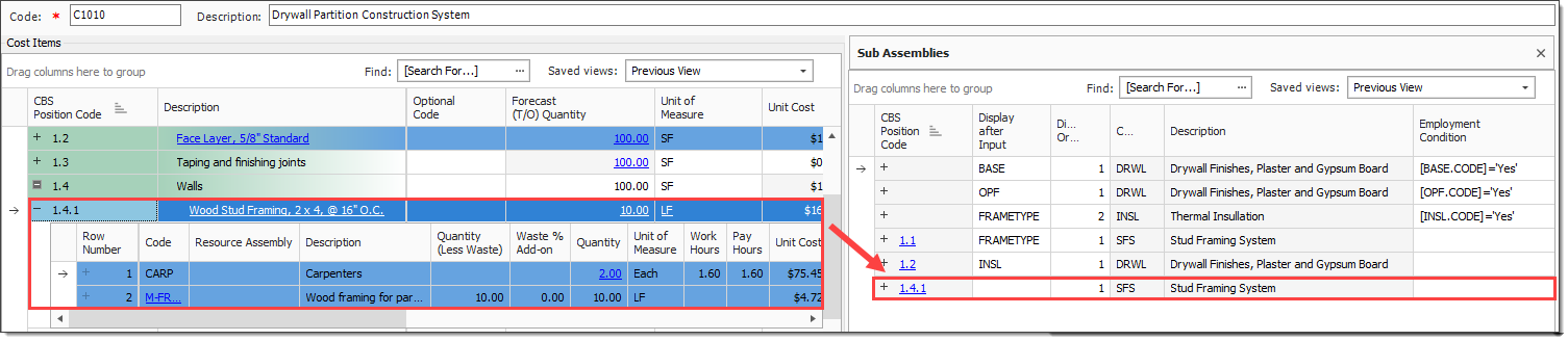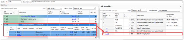 Under the Cost Items window you will see the cost item assemblies listed. On the right side of the screen will be the sub assemblies relating to each cost item.