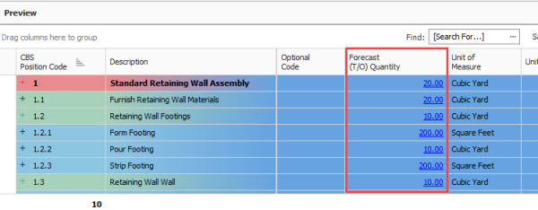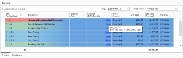 To view the formulas used to calculate the values of the cost items, in the Cost Breakdown Structure (CBS) Register hover over the Forecast (T/O) Quantity line items. This will help you to understand how these values were determined.