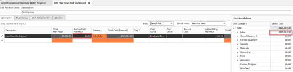 Double click on the newly named Contingency row header to open the CBS Man Hour Add-On Record.