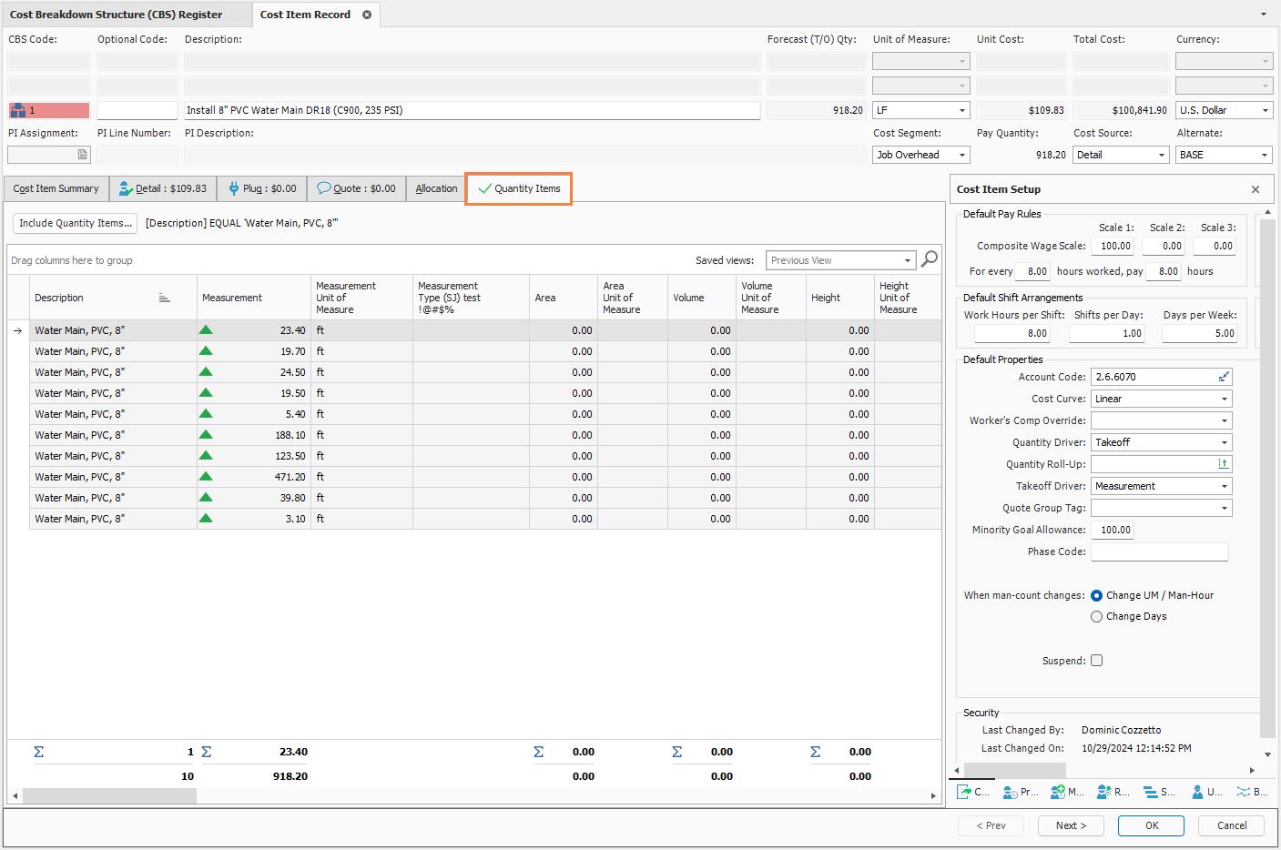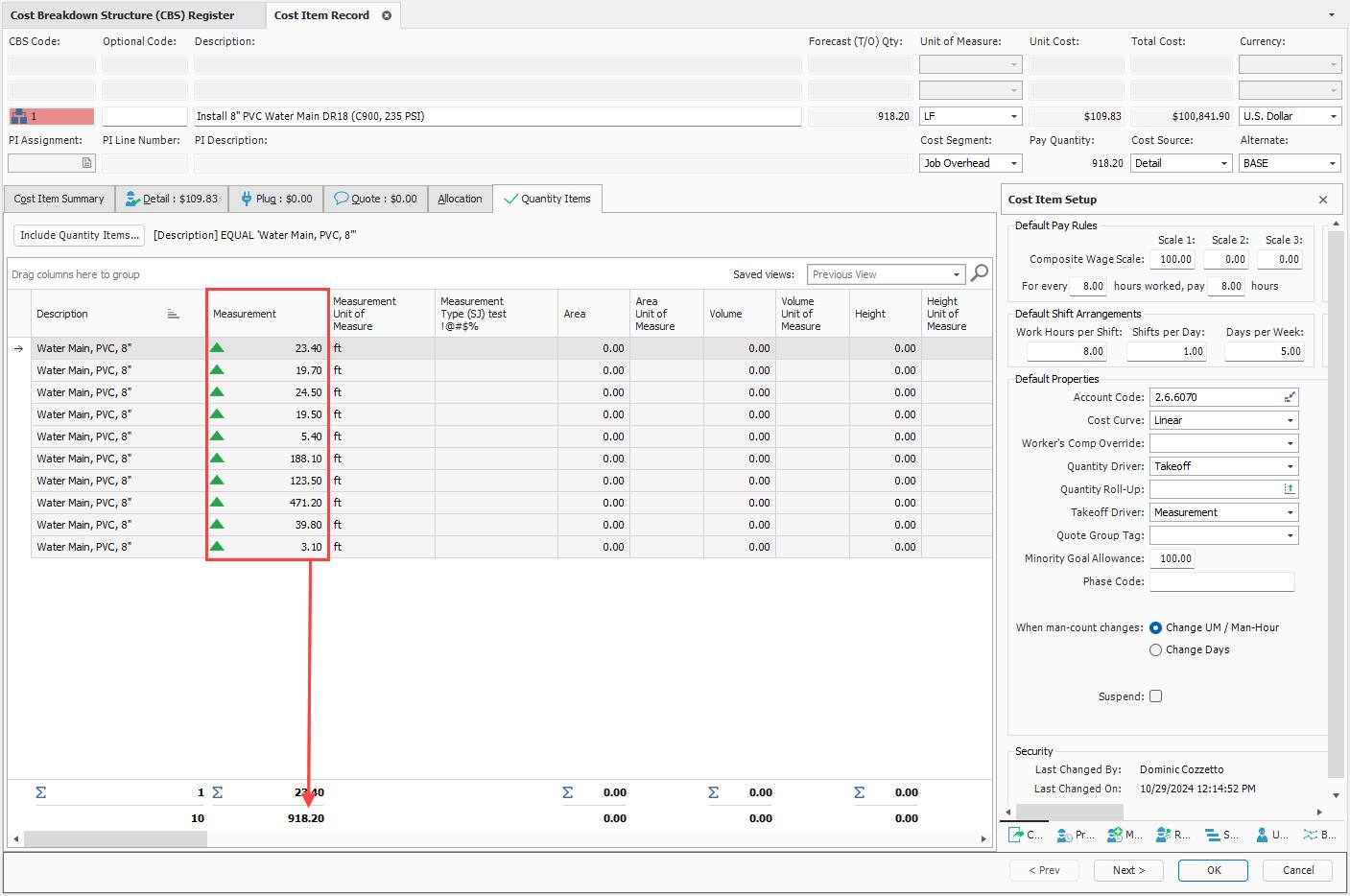 View the aggregate total of the cost item quantity. In the image below, the Install 8” PVC Water Main DR18 cost item, you can see the total of 918.20 ft, and you can also see all the markup items that make up the total.