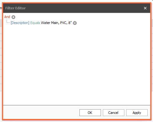 You can use filters to find items that you want to apply to a cost item. To set a filter, click the Include Quantity Items button, and then set up your filters. For example, you can configure a filter in the Install 8” PVC Water Main DR18 cost item to bring in items that contain Water Main, PVC, 8” in the description.