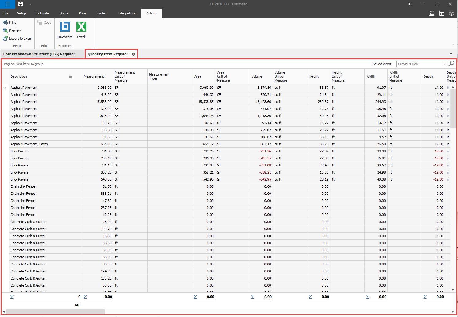 In the Quantity Items Register, you can view the list of quantity items imported from your source document. After the import is complete, you can apply quantity items to cost items in the Cost Item Record’s Quantity Items tab.
