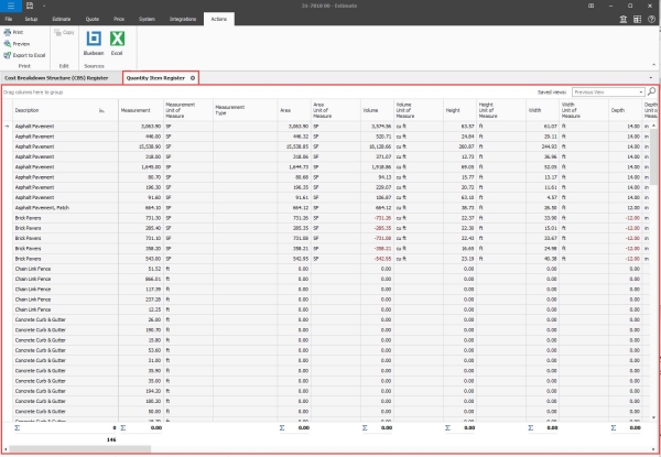 The Quantity Item Register columns provide quantity item details brought over from Bluebeam’s take-off data, including crucial information to assure that your estimate is accurate and up-to-date. Information brought over includes Page Label, Data Source, Reference Number, Quantity Item Author, Last Updated, Last Updated By. You can manage quantity items by filtering and grouping columns.