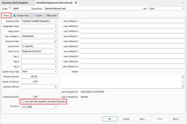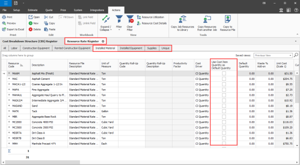 Resource rate default quantity — The Use Cost Item Quantity as Default Quantity feature can now be selected for resource rate records. When you select resources in your estimate and the option is selected, the resource rate record inherits the cost item quantity. This feature saves time and helps prevent potential mistakes by having to manually re-enter quantities after employing resources.