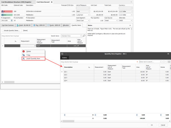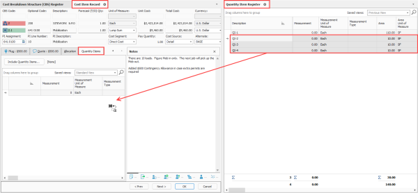 Manually insert quantity items into cost items – You can now manually associate quantity items with cost items by dragging and dropping or inserting them directly into the Cost Item Record. This option provides greater flexibility when working with estimates and allows you to quickly associate a quantity item without having to modify or create existing filters.