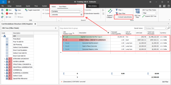 Include subordinates in the CBS filter – A new Include Subordinates option is available when applying filters in the CBS. When selected, subordinate items under the filtered superior items are shown even if they do not match the filter text. This option is especially useful when estimating large CBS structures where similar work shows across multiple areas, preventing you from having to scroll to find and update superior related items.