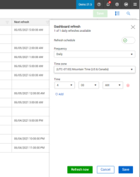 Set the Refresh schedule toggle to view and make changes to the settings. You can click Refresh now to manually refresh the selected dashboard. A manual refresh does not count towards the available number of daily scheduled refreshes.