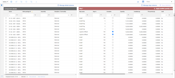 When the URL is accessed, the grid shows with the applied filters and the URL returns to its default value for the Plan Quantity tracking page. The component edit slide-out shows the matching records.