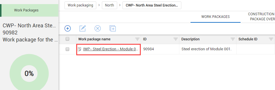 From the Work Packages tab, open a Construction Work Area (CWA) and click on the arrow in the ID column of your Construction Work Plan (CWP) to extend the work package below.